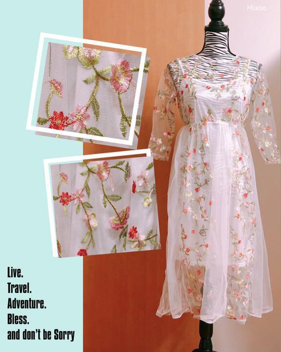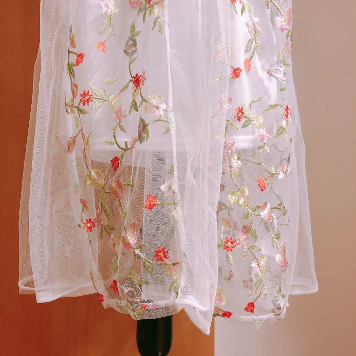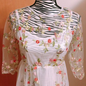 トレンド刺繍花柄チュ-ルワンピ-スです。トレンド感たっぷり色の美しいエレガントなワンピ-スです。デザイン性のあるスタイルがとても魅力的な一着です。可愛いデザインで全体的に優しい感じに仕上げられています。ファスナ-なし(かぶるタイプ)。キャミソ-ル付き。