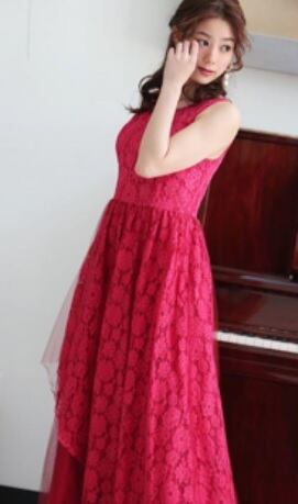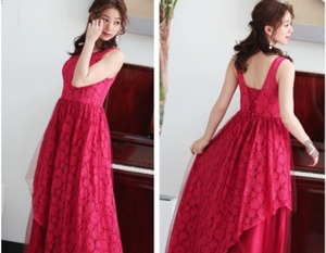 情熱的な背中ゴムと編み紐掛け総レースドレス。鮮やかな赤のレースを胸元とウエストから裾にななめにかけてあしらった情熱的なデザイン。動くたびにレースの下のチュールが軽やかに流れ、ボリューム感と華やかさがふんだんに盛り込まれた魅力的な一着です。背中はゴム仕様になっていて、その上に左右から紐をかけてサイズを調整できるようになっています。コンサート、ライブ、結婚式の二次会、パーティにとどんなシーンにも活躍してくれます。裏地あり。背中ゴム仕様と編み紐掛け。左脇ファスナ-有。胸パット付き。