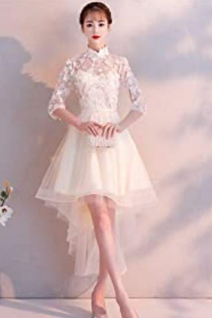 花モチーフのフィッシュテールドレス。上半身には金のスパンコールと光沢のある糸で刺繍を施した上に花のモチーフをいっぱいにあしらっています。スカート部分は、前と後ろで長さの違うフィッシュテールタイプで華やかさを演出。パーティや結婚式の二次会、コンサートにといろいろなシーンに活躍してくれる一枚です。背中ファスナー。裏地有。胸パッド付。