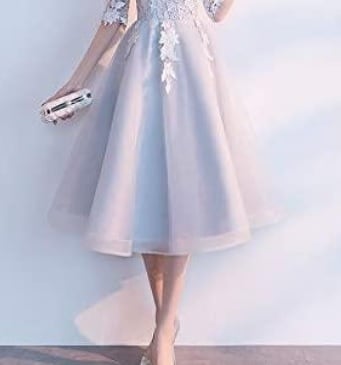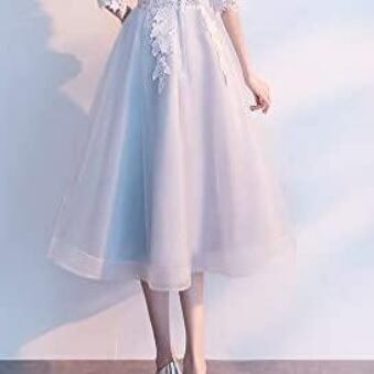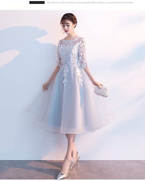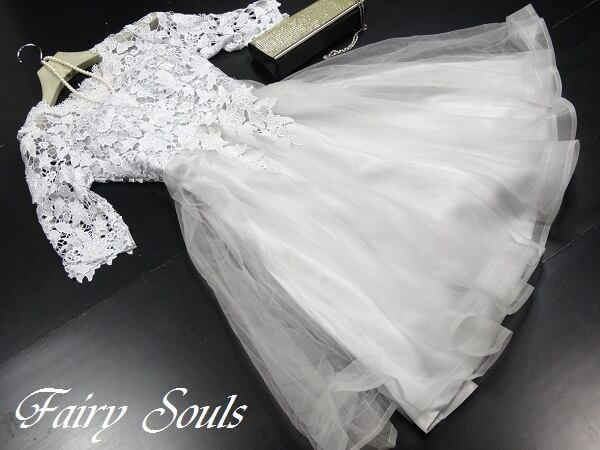 刺繍チュールのパ-ティ-ミディアムドレス。トップスと袖にはチュールの上に立体刺繍が施され華やかな印象に。スカート部分はサテン地の上に同色のチュールが重ねられ豪華かつエレガントな雰囲気に。パーティやイベント、結婚式など、様々なシーンで、気品のある印象を与えてくれる一枚です。裏地なし(サテン地とチュール地の2枚重ね)。背中ファスナ-有。胸パット付。