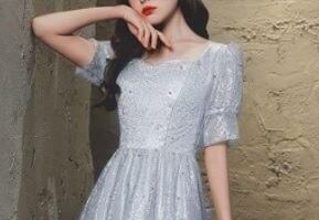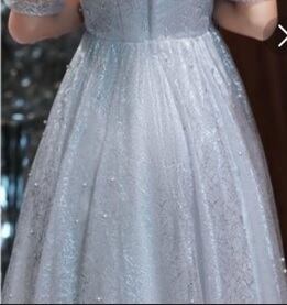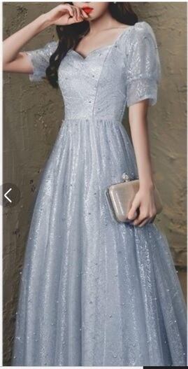 ラメ刺繍とチュ-ルレースのロングドレス。シルバーグレーの下地の上に、銀糸のラメ刺繍をあしらったチュールレースを重ねた華やかなデザインです。袖の途中を絞ったデザインがとてもキュート。パーティやライブ、イベント、結婚式など、どんなシーンでも活躍してくれる一着です。裏地なし(サテン地とチュール地の2枚重ね)。背中ファスナー有。胸パット付き。