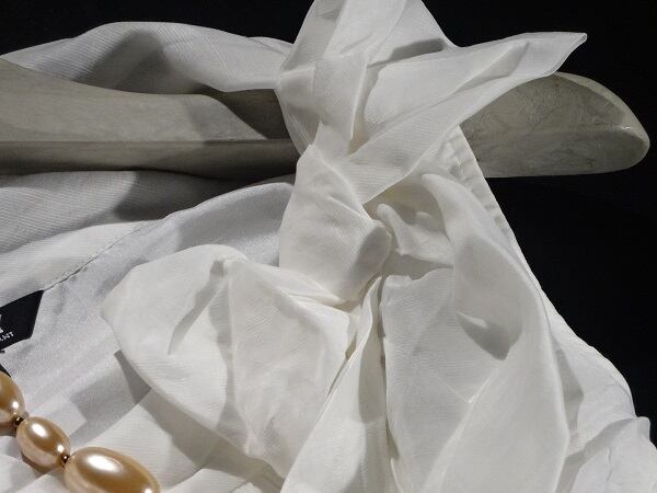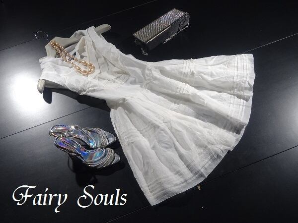 襟ぐりから首元にかけての生地が緩やかに胸元にかかり、左肩のリボンがアクセントになっています。襟ぐり下からウエストにかけては縦のプリーツ仕様になっており、スカート部分は裾とヒップ下あたりに横に数本のラインが入り切り返しのようになっています。白一色のシンプルなデザインに見えて、細かい仕様を施した素敵な一着です。薄手の軽い生地を使用しておりますので、若干透け感があります。気になる方はインナー着用をお勧めします。脇下ファスナー。裏地あり。