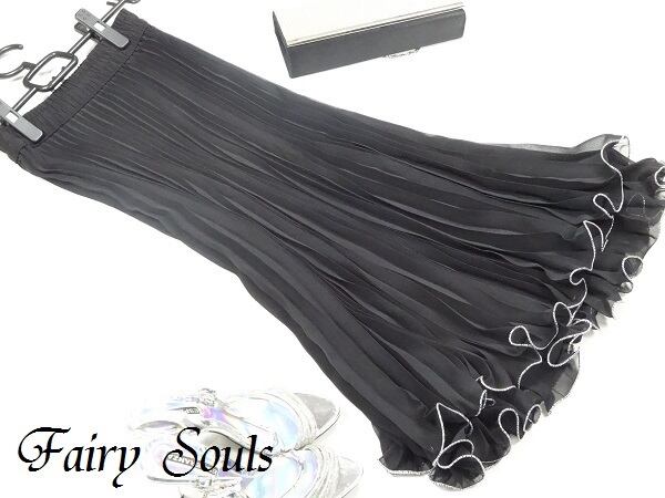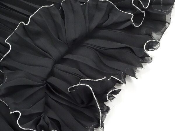 社交ダンスに最適なプリーツ仕立てロング丈のスカート。約1cm幅のプリーツは動きに合わせて綺麗に広がります。裾にはシルバーのラメを用い華やかで上品な印象をあたえています。ウエストは総ゴム仕様でサイズにゆとりがあります。裏地付。
