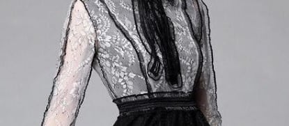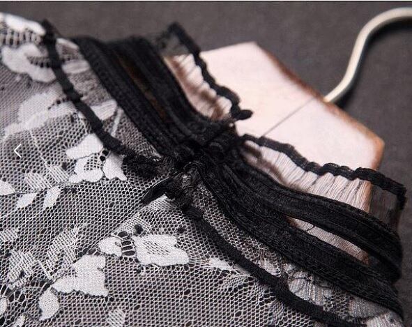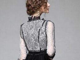 胸元リボンがキュートな総レースのワンピース。黒の下地の上に、上半身は黒と白のレースをあしらい、ウエストから裾までは黒一色のレースを使用したフェミニンなデザインになっています。胸元のレースのリボンがシックな中にキュートな愛らしさを表現してくれています。パーティやイベント、コンサート、結婚式にと、さまざまシーンで活躍してくれる美しい一着。背中ファスナー。裏地付。