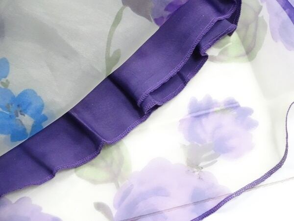 きれいなパープルでふんわりやわらか素材。腰紐がついていてウエスト調整出来るから自分でくびれを作れます。たいへん綺麗な色で女性度UP間違いありません。ファスナー脇下あり。裏地有。