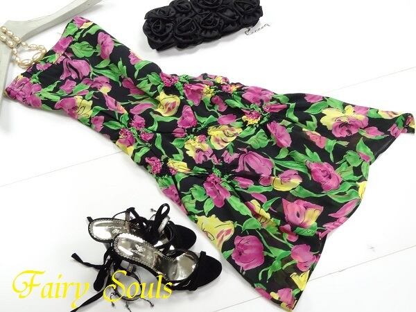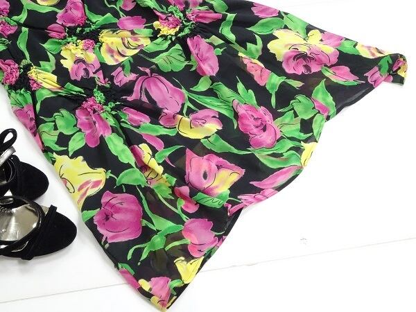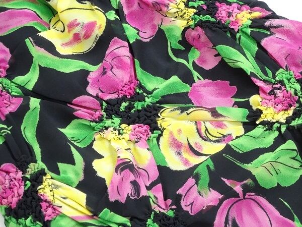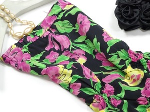 シャーリングベアタイプのワンピース。胸元は幅広のゴム仕様で胸元をきゅっと締めています。本体の数か所、花模様の花の部分がつまみシャーリング仕様になっていて、シルエットにめりはりがあり可愛いデザインです。肩紐はついていませんので、バストサイズが記載よりも小さい方はずり落ちる可能性がありますのでご注意ください。脇下ファスナー。裏地あり。