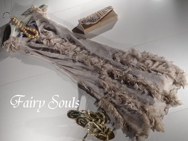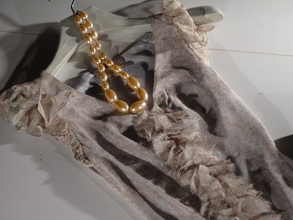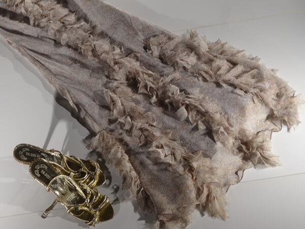 しなやかなペイズリー柄がプリントされたシフォンのワンピース。胸元はセクシーに見えるV字カット。裾にかけてフェザー風なシフォン地がほどこされた魅力的な一着です。ファスナーなしのかぶるタイプ。裏地付。