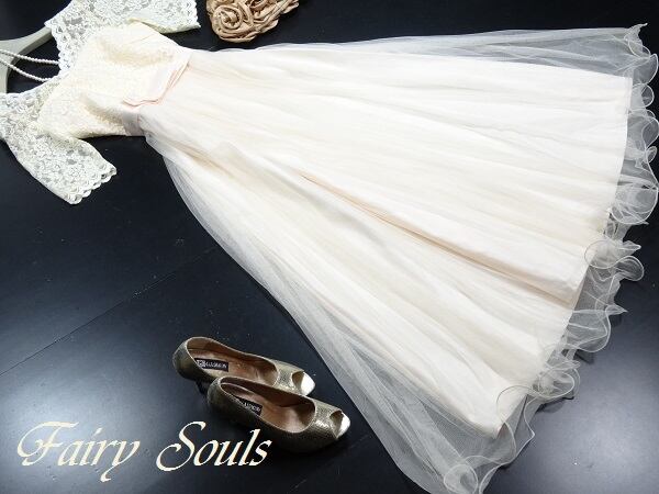 サテンとチュールのパーティーロングドレス。クリームカラーのサテン地に上半身には薔薇柄のチュールレース、ウエストから裾にかけては無地のチュールをたっぷりとあしらい、エレガントで上品な雰囲気になっています。ウエストのサテンのリボンがキュートさを演出してくれています。パーティやイベント、結婚式など、様々なシーンで、気品のある印象を与えてくれる一枚です。裏地有。背中ファスナ-有。