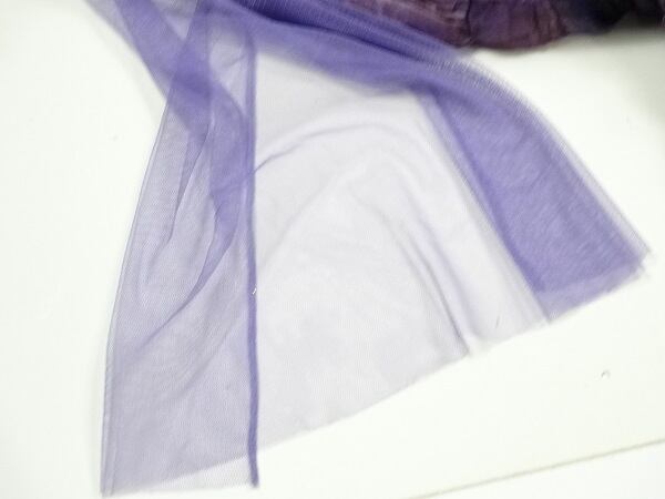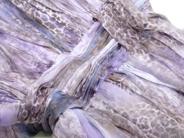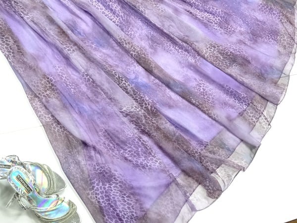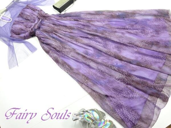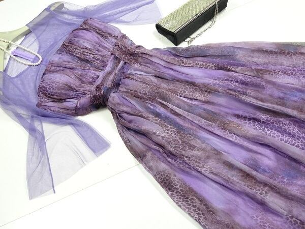 シフォンとチュールが美しいカラードレス。深みのあるアニマル模様の紫のシフォンをたっぷりと使用。胸元はデコルテラインから袖にかけてはチュールを配し、ウエストまでは縦にプリーツをとり、ウエストは片側でウエストリボンをまとめたような凝ったデザインになっています。ウエストからスカート裾までは、しなやかなシフォンが揺れるごとに着る人の足元を美しく見せてくれます。パーティやライブ、イベント、結婚式など、どんなシーンでも活躍してくれる一着です。裏地有。背中ファスナー有。胸パッド付。