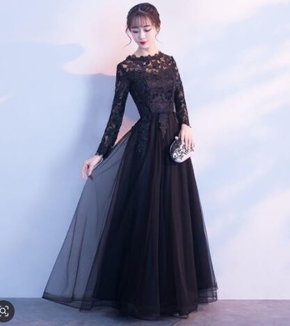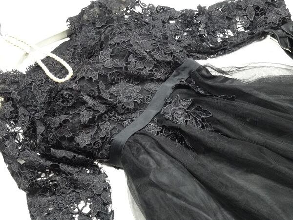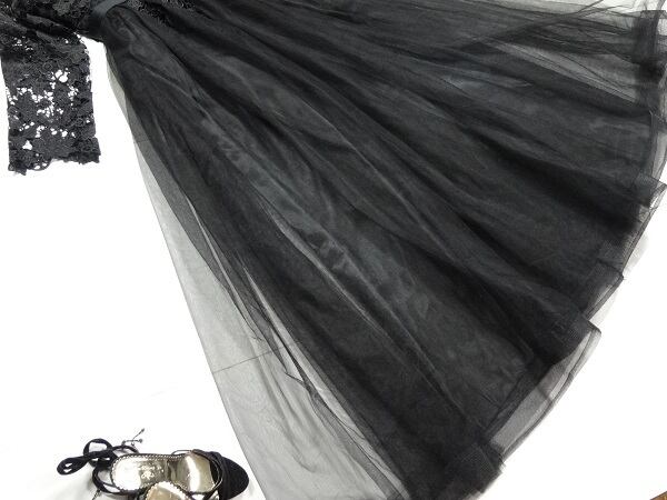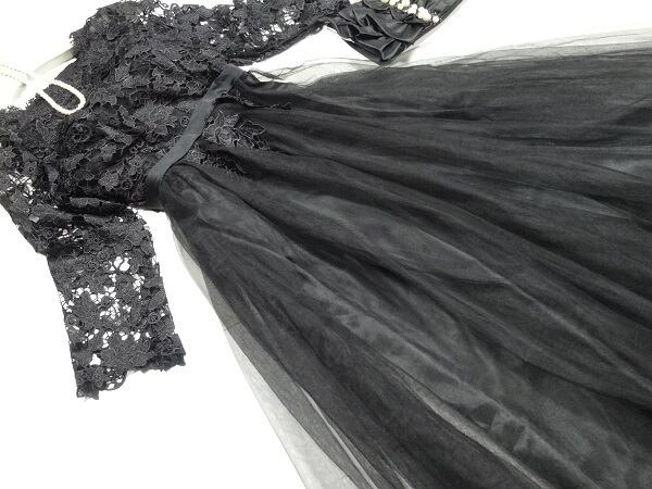 立体刺繍ロングチュ-ルパ-ティ-ドレス。シックな黒のサテン地の上に、同色の立体刺繍をほどこしたチュ-ルが重ねられた豪華でフェミニンなデザイン。V字の胸元が大人の雰囲気を醸し出し、シックで上品な女性を表現。パーティやイベント、コンサート、結婚式にと、さまざまシーンで活躍してくれる美しい一着です。背中ファスナー有。胸パット付。