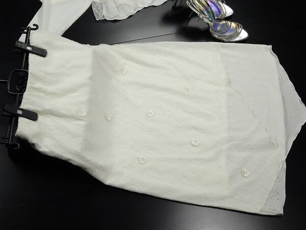 カットソージャケットと変形スカートのセットです。トップスとスカートそれぞれ白のジャージ素材の上に立体レースや小さな可愛い蝶のモチーフをあしらい豪華な印象に。ともに裾はレース部分とジャージ素材の長さを左右で変えて変化を持たせています。スカートはウエストが幅広のゴム仕様になっているのでサイズに伸縮性があり、かっちりとした印象に変化を持たせたユニークで魅力的なデザインになっています。トップスは背中ファスナー。裏地有。