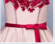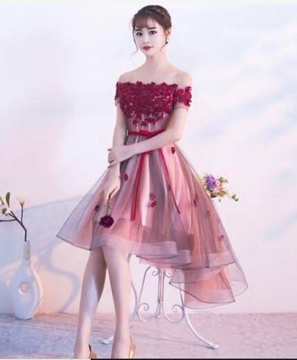 フィッシュテ-ルのパ-ティ-ドレス。やさしいピンクのサテン地にチュールをかぶせ、胸元と袖、スカート部分には真っ赤なレース刺繍にかわいい花のモチーフをあしらっています。前と後ろで裾の長さが違うフィッシュテール型。胸元から肩にかけてはチュールのみを使用しているので、着用時オフショルダーに見え、キュートさの中にもセクシーさをあわせもった魅力的なデザインになっています。背中が腰まで編み紐掛けになっているのでサイズ調整が可能。ウエストの赤いウエストリボンがアクセントに。エレガントで、パーティやイベント、結婚式など、様々なシーンで、気品のある印象を与えてくれる一枚です。裏地あり。背編紐掛け。腰から下ファスナー有。胸パット付き。
