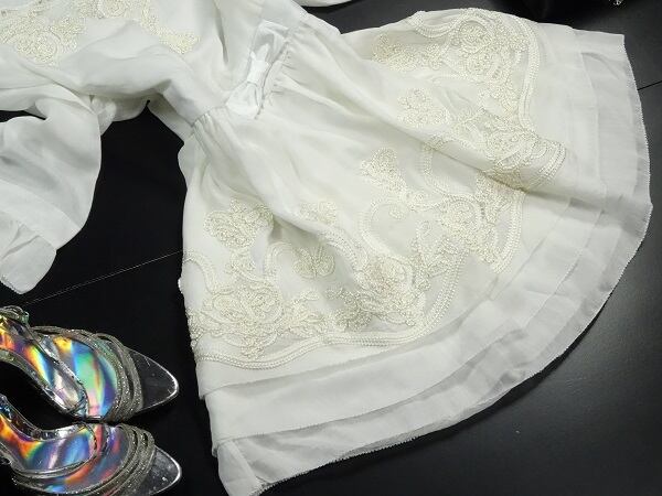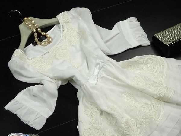 人工シルク20%のしなやかな生地に、艶やかな白の刺繍糸でエスニックな模様が刺繍されたロマンチックなワンピース。袖は幅広で腕の動きもスムーズな着心地の良いデザイン。ウエストには中央にリボンがあしらわれ、可愛らしさをアップ。裾は3段のレイヤータイプ。ピュアで品の良い一着です。サイドファスナー。裏地付。