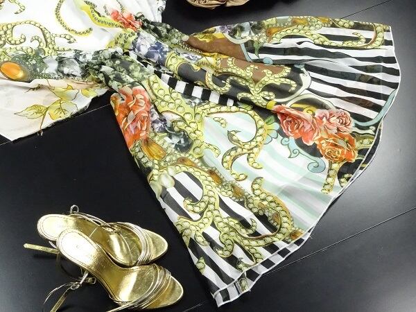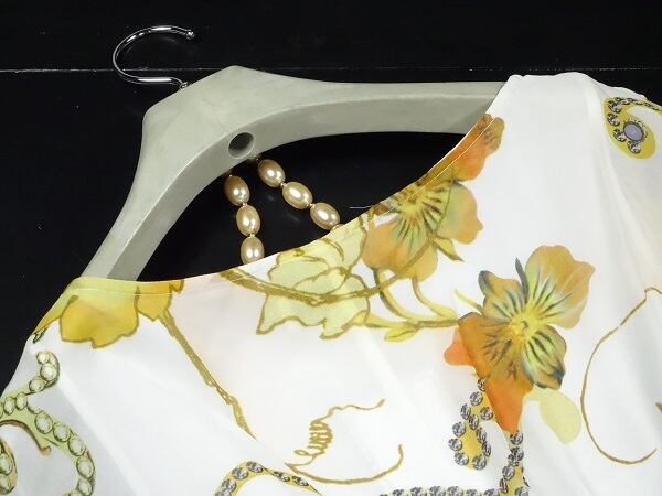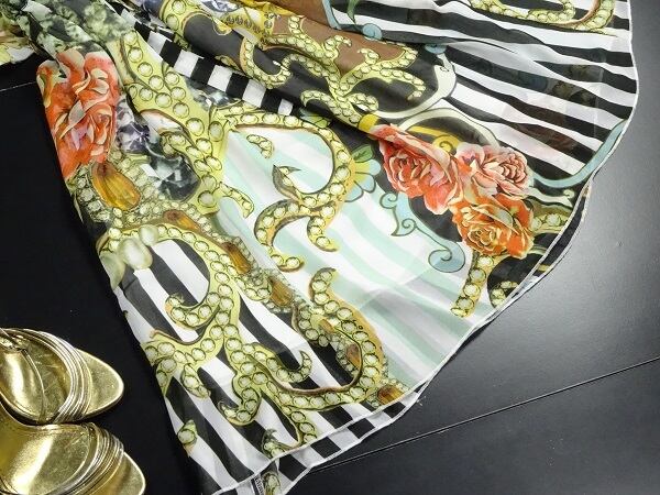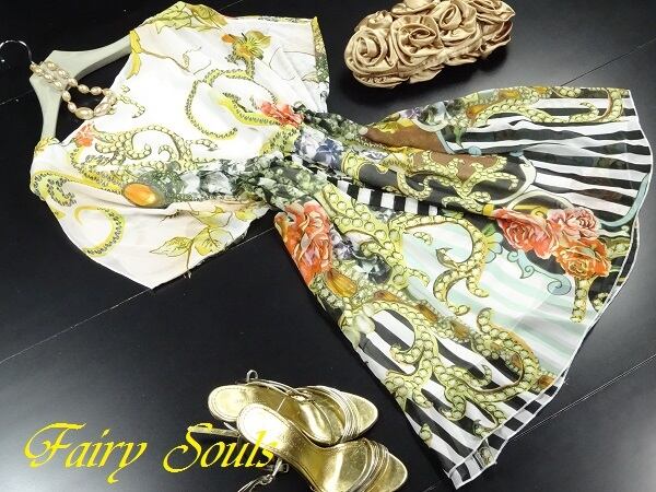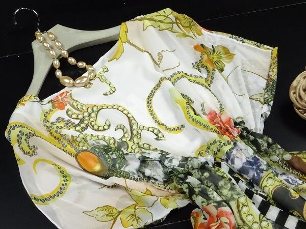 ふんわりシフォン生地を使用したスカ-フ柄プリントが魅力的なシルクシフォンワンピ-スです。シルクの着心地もとても良くこの一で華やぎます。ウエストリボン付き(取り外し不可)。裏地あり。ファスナ-なし(かぶるタイプ)。