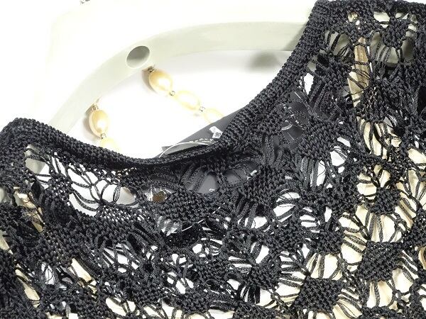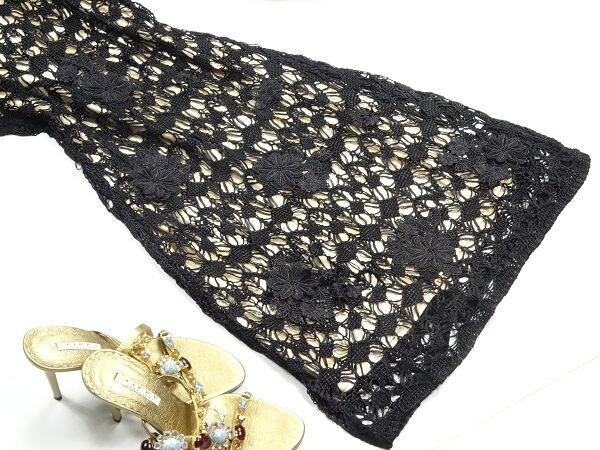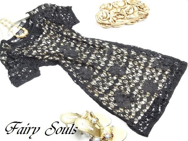 インナー付きレース仕様のワンピース。インナーはキャミタイプシャンパンゴールドのサテン地。アウターは半袖で、ニット仕立ての編み込みレース。黒の網目の間から、インナーのゴールドカラーが見えて、エレガントで優しい印象を与えてくれます。デート、お呼ばれ、パーティ、コンサート、結婚式にと、さまざまなシーンに活躍してくれます。ファスナーなし。キャミソール付。