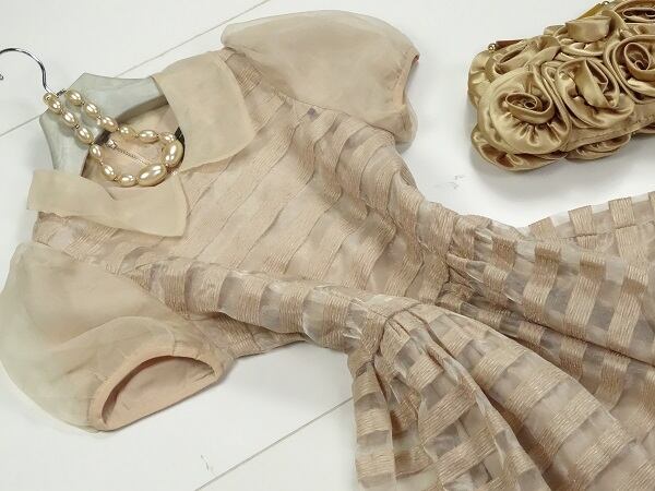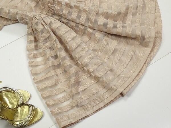 程よい透け感とボ-ダ-が上品かつ優雅なワンピースです。可愛らしいデザインで可愛らしい女性を表現してくれ全体的に優しい感じのワンピ-スです。背中ファスナーあり。裏地あり。