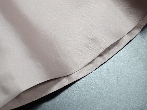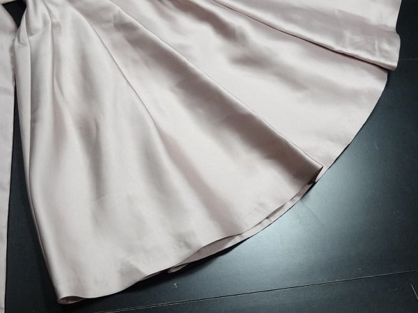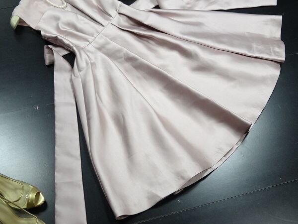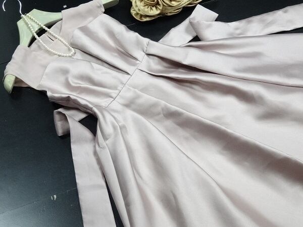 光沢のあるサテン地リボンベルト付ワンピ-ス。胸元はシフォンで、胸元から切り返しが入り裾までは光沢のあるしっかりとした感触のサテン地を使用。裾までゆったり広がるシンプルデザインで、同布のリボンベルトをきゅっと結んでアクセントに。背中は編紐掛けになっているのでバストサイズの調整が可能です。ちょっとおしゃれな普段着としても、またパーティやコンサートなどフォーマルなシーンでも活躍してくれる一着です。裏地あり。左脇ファスナ-有。リボンベルト付き。