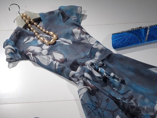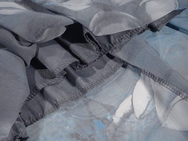 シルクの着心地がとても良いワンピ-スです。デザイン&プリントが素晴らしい一着です。裏地あり。背中ファスナ-有。布紐ベルト付き。