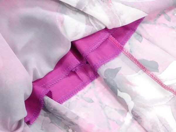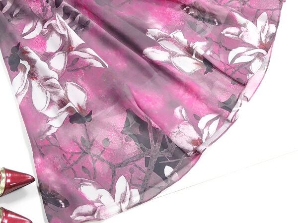 シルクの着心地がとても良いワンピ-スです。デザイン&プリントが素晴らしい一着です。裏地あり。背中ファスナ-有。布紐ベルト付き。
