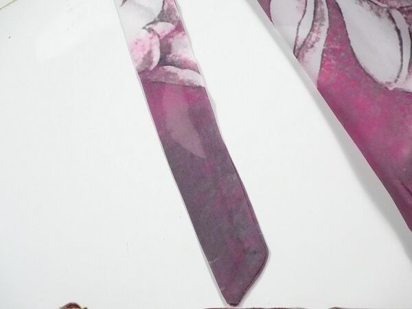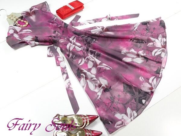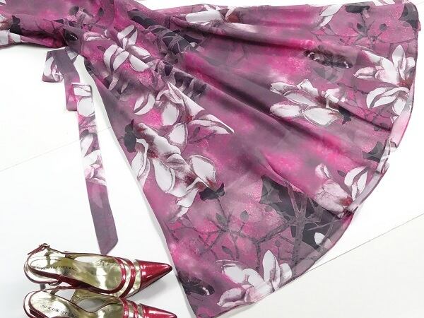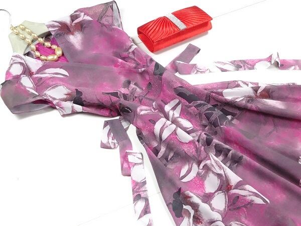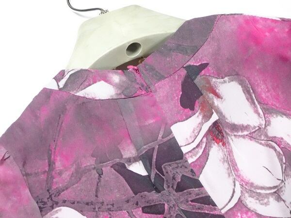 シルクの着心地がとても良いワンピ-スです。デザイン&プリントが素晴らしい一着です。裏地あり。背中ファスナ-有。布紐ベルト付き。