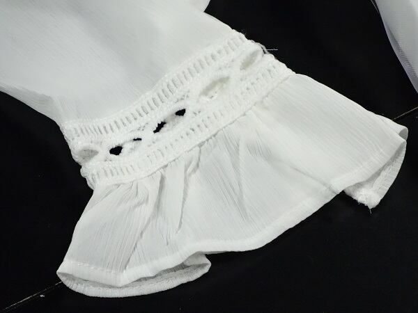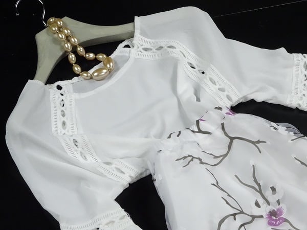 ブラウスと花模様のスカートのセット。ブラウスは広く開いた襟元から脇にかけてと、袖先にレースのスリットが入っており、スカートはオーガンジーの上地にシックな花模様がプリントされています。ピュアでエレガントな印象の一着です。ファスナーなし。スカートはウエスト総ゴム仕様で伸縮性があります。裏地有。