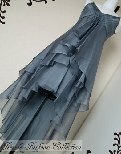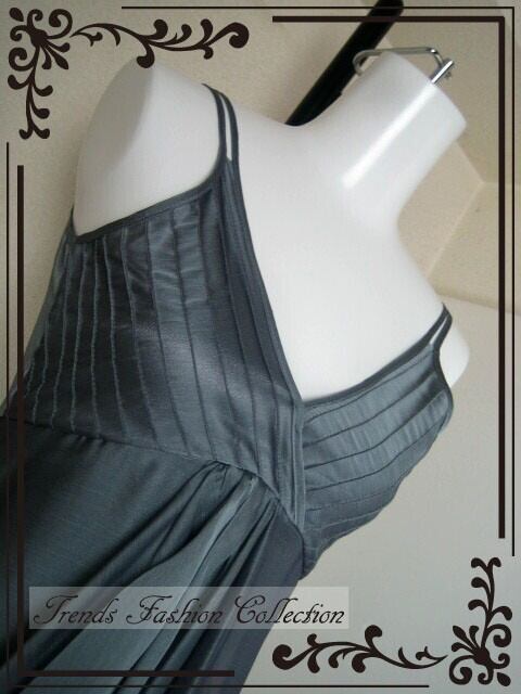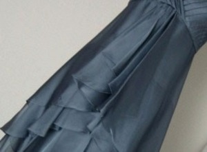 つるつるシフォンフリルフィッシュテールドレスです。つるつるとした光沢のあるシックな濃いシルバーグレーのシフォン地をふんだんに使用したキャミタイプのドレス。左右の胸元からウエスト中央に向けて細いタックをとり、ウエストから裾にかけては、重ねたシフォンのフリルが美しいラインをつくっています。前と後ろで裾の長さが違うフィッシュテール仕様。ちょっとおしゃれな普段着としても、またパーティやリゾート地、結婚式の二次会にと、さまざまなシーンで活躍してくれる一着です。裏地有り。背中ファスナ-有。