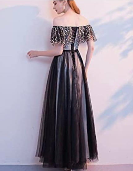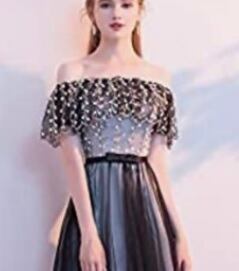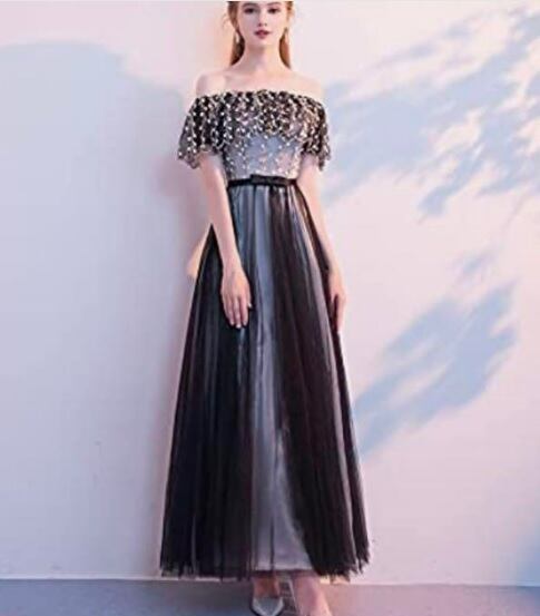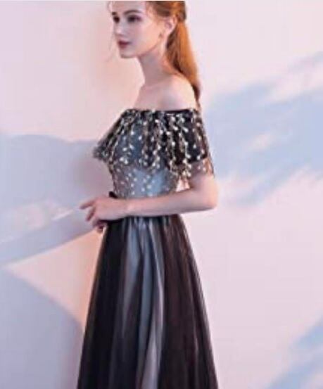 金糸刺繍のオフショルダードレス。トップス部分はデコルテラインを美しく魅せるオフショルダー。胸元からウエストにかけて金の糸で刺繍をほどこし、白の糸で花を模した刺繍が金刺繍とからみあって豪華かつエレガントな雰囲気を醸し出しています。パーティやイベント、結婚式など、様々なシーンで、気品のある印象を与えてくれる一枚です。裏地付き。背中編み紐掛け。腰から下ファスナ-有。胸パット付。