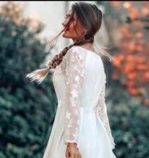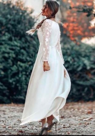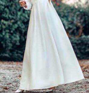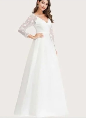 サテンとレース袖のパーティードレス。光沢のある白のサテン地をふんだんに使用した長袖のドレス。胸元はV字カットで、肩から袖にかけて艶のある糸で刺繍をほどこしたレース仕様になっています。格調高く、ボリューム感あるはなやかな印象に仕上げています。パーティやイベント、結婚式など、様々なシーンで、気品のある印象を与えてくれる一枚です。裏地なし。背中ファスナ-有。胸パットはついていません。