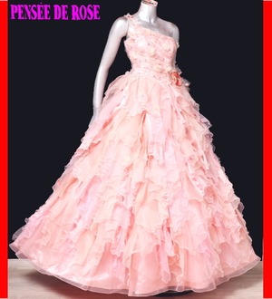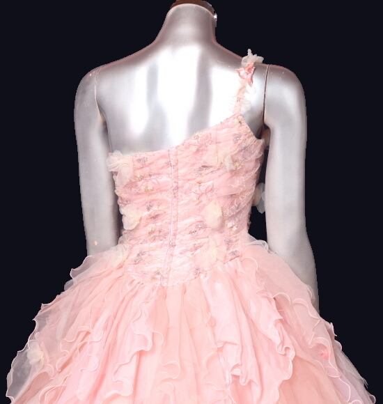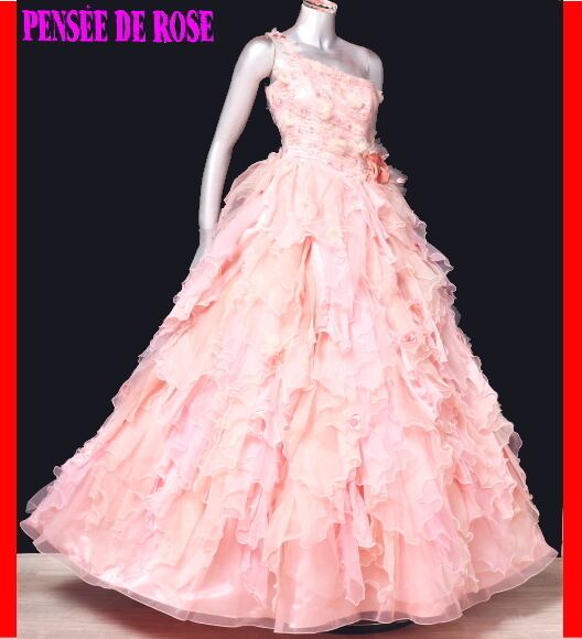 ワンショルダーフリルのウエディングドレス。ピンクのサテン地の上にピンクのオーガンジーフリルを使用した豪華なデザイン。胸元から裾にかけてあしらわれたたくさんのフリルが、華やかでかつ上品で全体的に優しい感じに仕上げています。右肩のみのワンショルダータイプ。生地を多く使用している分少し重さがあります。結婚式、パーティ、コンサートにと、華やかなシーンに最適な一着です。裏地有。背中ファスナ-。ウエストのコサージュは取り外し可能。肩紐は長さ調整不可(約10cm)。