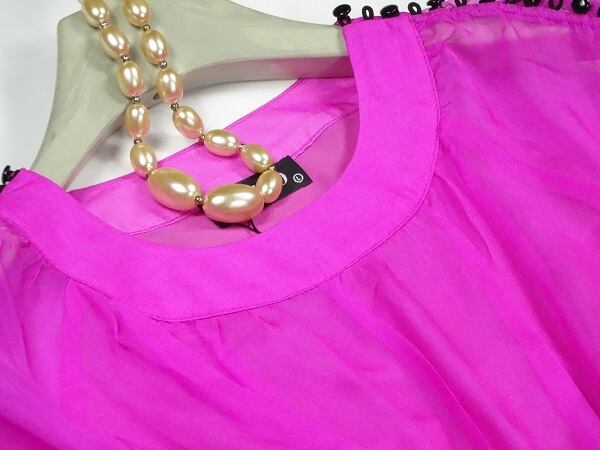 シルクの着心地のとても良いワンピ-スです。シンプルなデザインですが着心地やアクセサリ-などで楽しんでいただける一着です。裏地あり。ファスナ-なし。