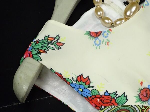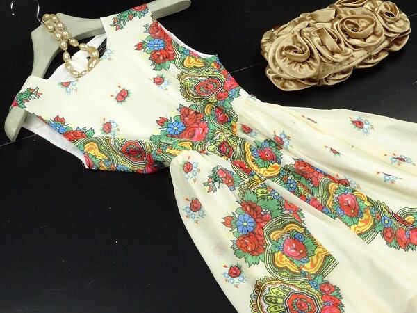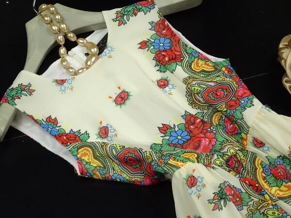 ポップで華やかな色彩と女性らしいデザインがとてもオシャレでしぐさを優雅にみせてくれるお洋服です。背中ファスナー有。裏地あり。