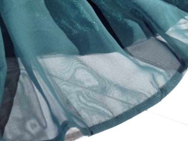 花モチーフ付グリーンのゆったりフレアワンピースです。襟のラインにかけて立体的な花のモチーフがあしらわれていて、たっぷりと贅沢に生地を使ったゆったりとしたラインは、体のラインを美しく見せてくれます。袖は透け感があり、暑い季節にも涼やかな印象を与えてくれます。柔らかく、しなやかな品の良いデザインです。スパンコール付きのベルト付。裏地有。