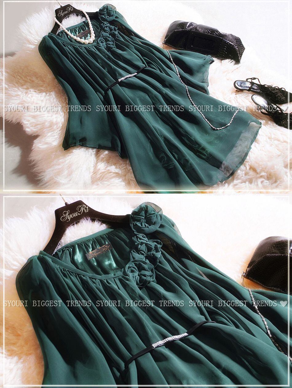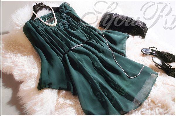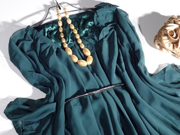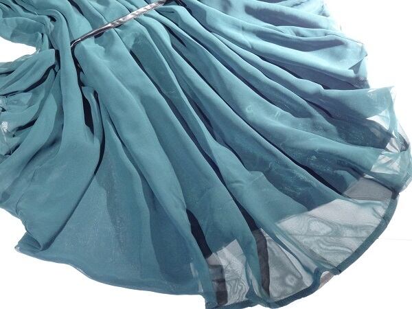 花モチーフ付グリーンのゆったりフレアワンピースです。襟のラインにかけて立体的な花のモチーフがあしらわれていて、たっぷりと贅沢に生地を使ったゆったりとしたラインは、体のラインを美しく見せてくれます。袖は透け感があり、暑い季節にも涼やかな印象を与えてくれます。柔らかく、しなやかな品の良いデザインです。スパンコール付きのベルト付。裏地有。