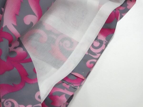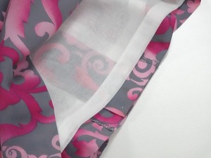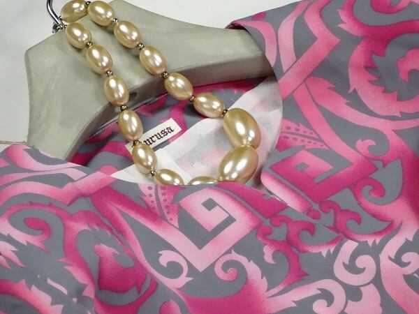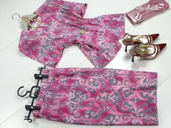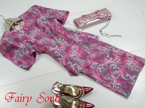 ピンクの柄物のスーツです。上地のフロント部分にはきらきら輝くボタンがあしらわれています。スカートはエレガントな印象に仕上がっています。ふんわり優しい魅力にあふれた一着です。スカートは後ファスナー。裏地付。