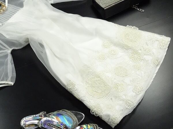 贅沢な高級感のある女性的なデザインが優雅な風格を醸し出し透明感のある素材がとてもエレガントです。パーティやイベント、結婚式など、様々なシーンで、気品のある印象を与えてくれる一枚です。インナ-付き。