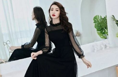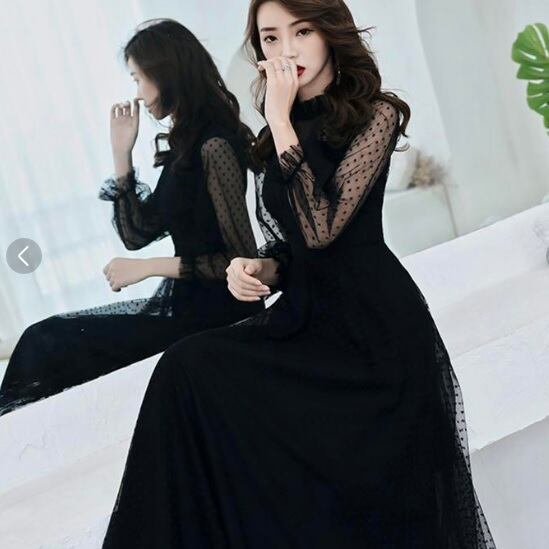 ドット柄のチュ-ルレースロングドレス。黒の下地の上に小さなドット柄をあしらった同色のチュールを2枚重ねたシックで華やかなデザイン。袖と背中上部はチュールレースのみでほのかに肌が見え、気品のあるセクシーさを醸し出しています。パーティやライブ、イベント、結婚式など、どんなシーンでも活躍してくれる一着です。裏地なし。背中ファスナー有。胸パット付き。