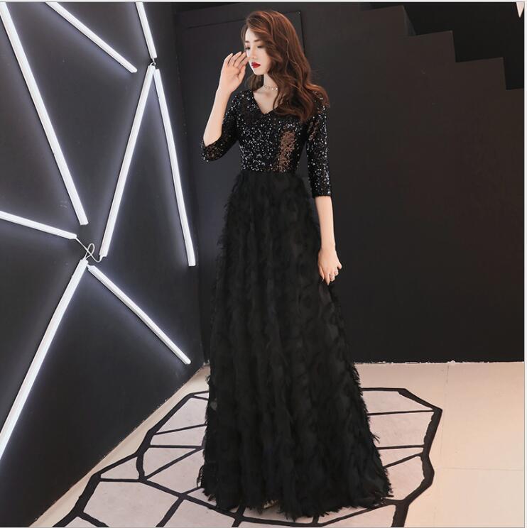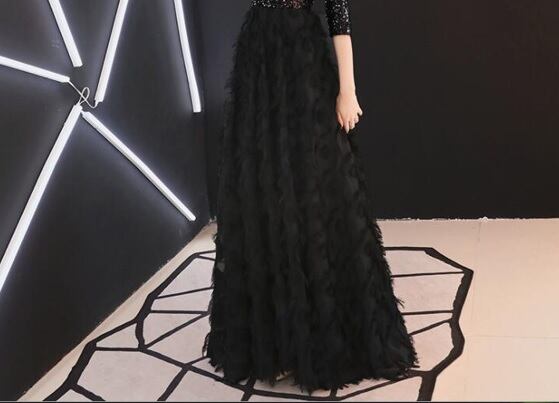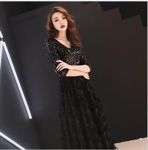 ビジュ-とフェザー仕様のロングドレスです。トップス部分はビジュ-が施され光のかげんでキラキラ輝きます。スカ-ト部分にはフェザー仕様がほどこされた魅力的な一着です。背中ファスナー有。裏地付。胸パット付き。
