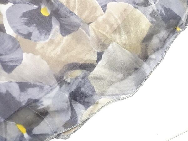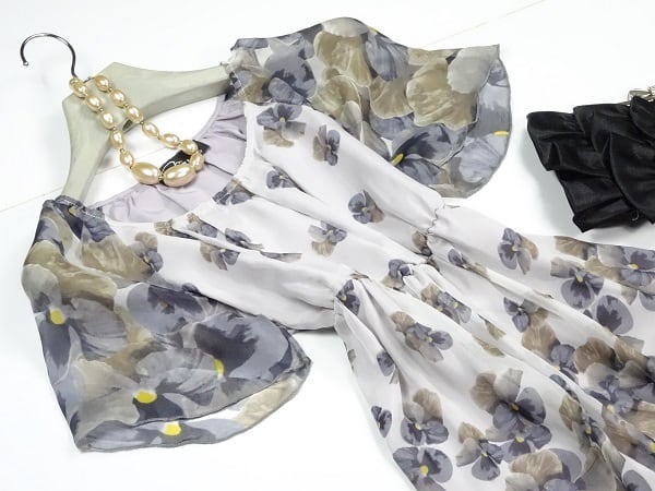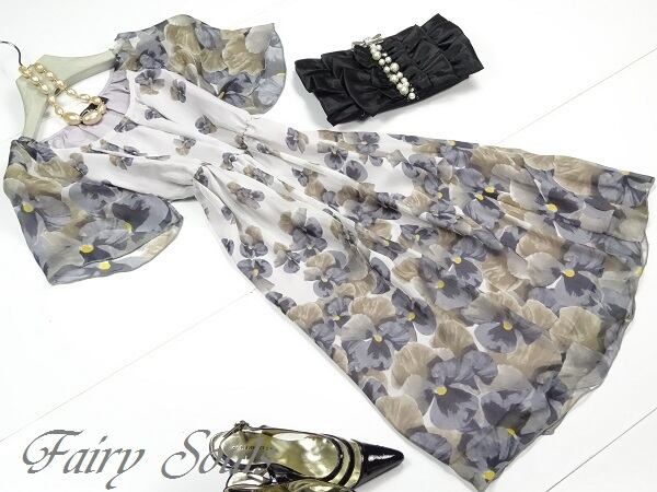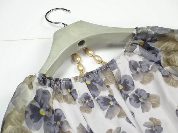 シックなシルクシフォンに花模様がプリントされたワンピース。襟ぐりはデコルテラインが綺麗に見えるラウンドネック。袖は動きやすいプチ振袖パターン。ふんわりと二の腕をカバーしてくれます。ウエストはゴム仕様で伸縮性があり着やすい一着です。ファスナーなしのかぶるタイプ。裏地あり。