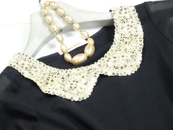 レースとスパンコールの襟がキュートなワンピース。伸縮性のある黒のジャージ素材に、スパンコールをあしらったベージュ系レースの襟がアクセントに。袖は透け感のあるシフォン使い。デート、お呼ばれ、パーティ、コンサート、結婚式にと、さまざまなシーンに活躍してくれます。ファスナーなしのかぶるタイプ。裏地なし。
