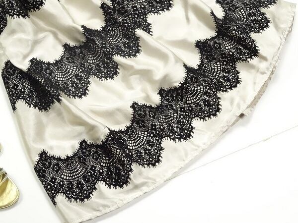 シャンパンゴールドレース飾りのベアトップワンピース。つややかなシャンパンゴールドの生地のトップスとスカート部分に黒のレースをぐるりとあしらい、シックな中に豪華な印象をプラスしたデザインになっています。パーティやライブなど、華やかなシーンに最適。キュートで魅力的な一着です。肩ひも付。左脇下ファスナー。裏地有り。