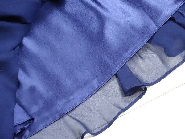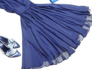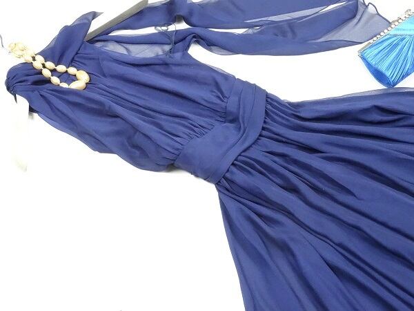 深い光沢のある紺の首元ストール付きドレス。色は落ち着いた深い紺。ローウエストに太いウエストの切り返しが入り、裾にかけてたっぷり使用した生地がボリューム感を出しています。クールで上品なデザイン。そでぐりは深く首元側に開いていて少し肩が出るタイプ。少し立ち上がった襟ぐりに、長いストールが縫い付けられており、結び方で様々な印象に。左襟ぐりについたボタンで襟元が広く開くので着脱が楽です。パーティ、イベント、結婚式の二次会、コンサートなど幅広いシーンで活躍してくれる一着です。右脇ファスナー付。裏地あり。