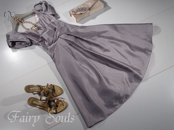 サテン系薄紫パフスリーブのミニドレス。袖はぷっくらとふくらんだ可愛いパフスリーブ。ウエストの幅広の切り返しがアクセントになっています。背中側は細い共布の編み紐になっていて、結ぶ強さでサイズを微調整。普段使いはもちろん、お呼ばれやデート、コンサート、パーティ、結婚式にと、幅広いシーンで活躍してくれます。左脇下ファスナー。裏地あり。