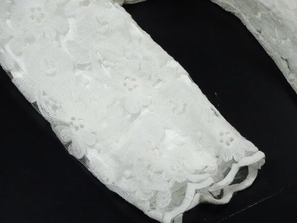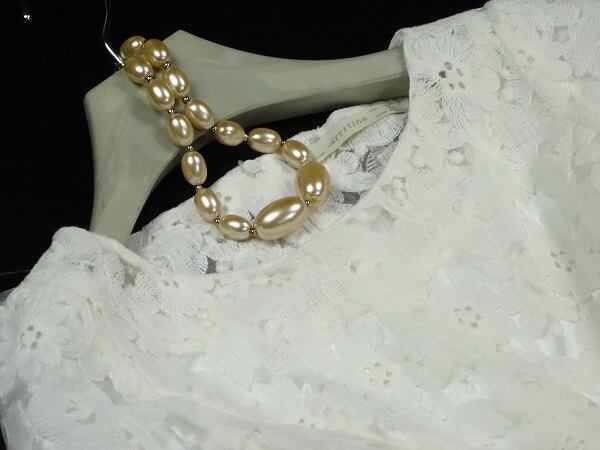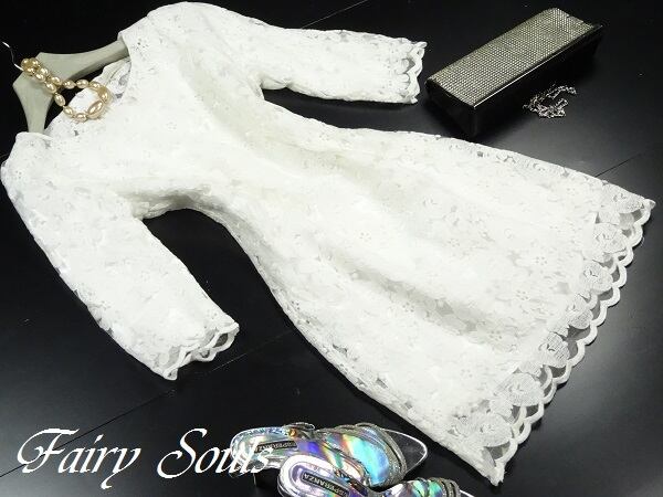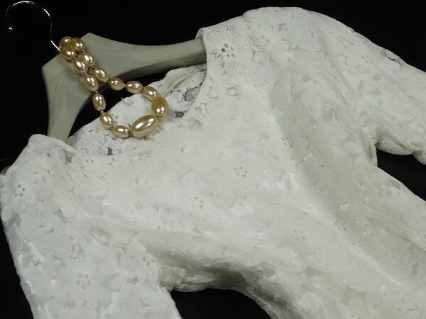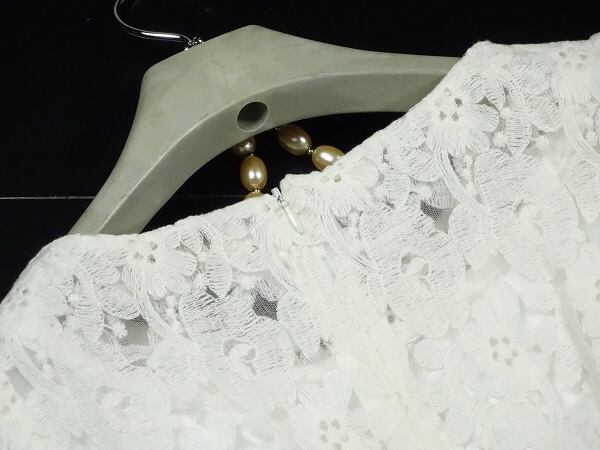 清楚な総レースのワンピース。襟ぐりはやさしいラウンドネックタイプ。下地の白に上地のレースが映えて魅力的なデザインになっています。背中ファスナー。裏地あり。