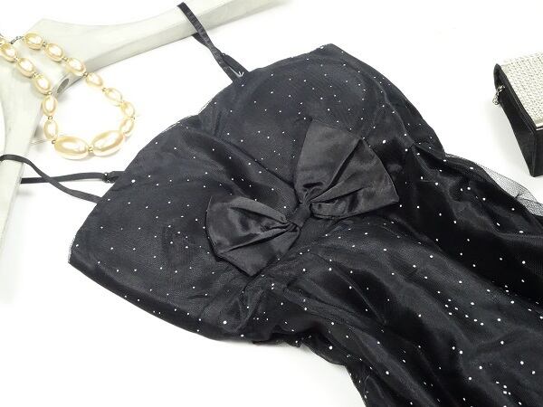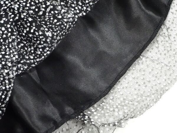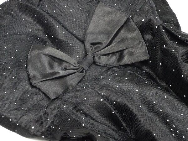 キャミソールウエストリボンチュールのワンピース。サテンの下地の上に白のドットがプリントされた黒のチュールを重ねています。ドットは裾にかけて密集していき、全体を立体的な豊かな印象に。ウエストのサテンのリボンがアクセントになっています。背中はシャーリング仕様になっているので伸縮性があり、サイズにゆとりがあります。表示は「M」ですが、実寸サイズ的にはゆったりした7号位になります。ファスナーなしのかぶるタイプ。裏地あり。