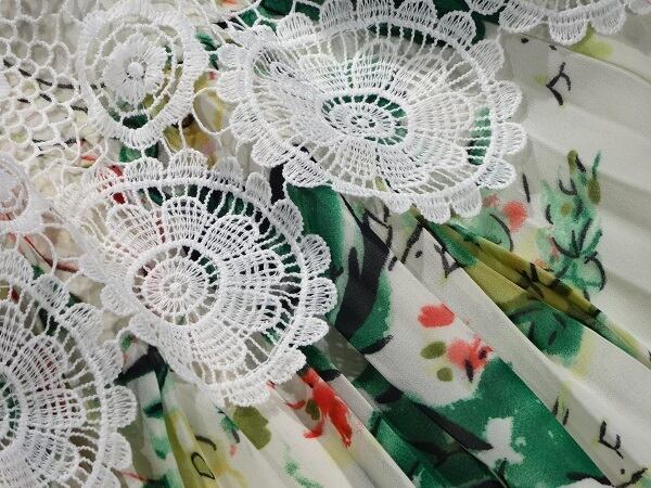 白地に爽やかなグリーンやピンク、赤の花模様がプリントされたスカート部分がプリーツ加工された涼やかなワンピースです。上見頃には鉤針編みのオーバーがセットされていて、ウエスト部分は花模様にカットされている凝ったデザインです。ピュアで品の良い印象を与えてくれる一着です。裏地有。