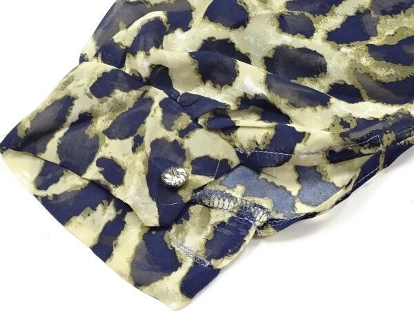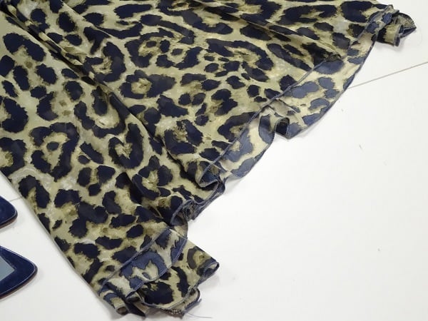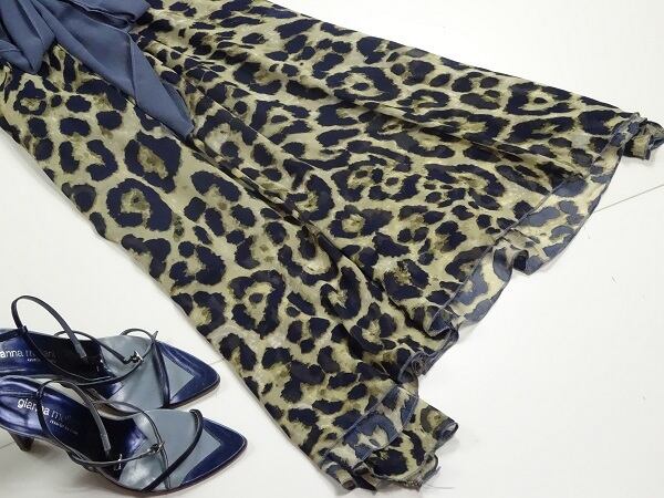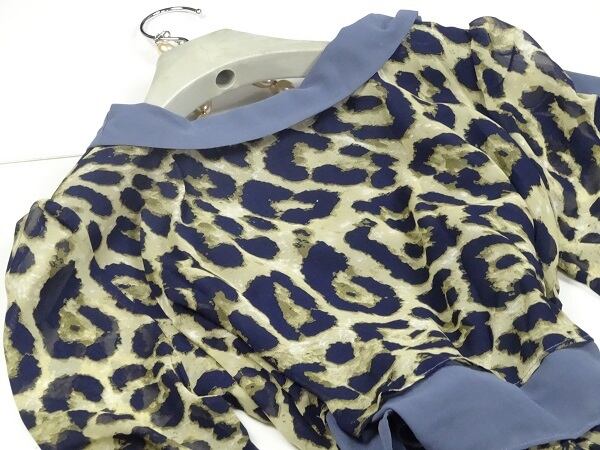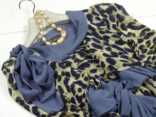 アニマル柄リボン飾りシフォンのワンピース。華やかなアニマル柄に、シックな灰青をアクセントに用い、肩とウエストの二か所にリボンで飾りつけをしています。豪華な中にシックな印象をプラスした一着。ウエストゴム仕様で伸縮性あり。ファスナーなしのかぶるタイプ。裏地あり。