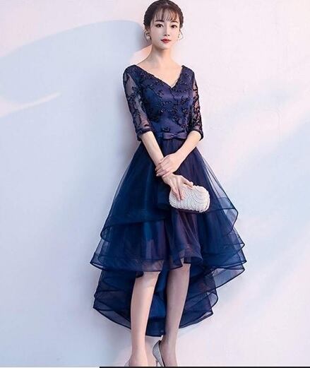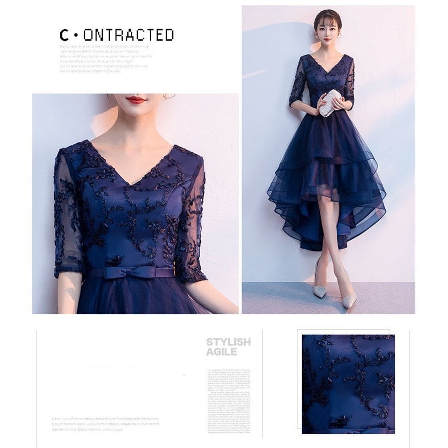 チュールとレースのフィッシュテ-ルドレス。ネイビ-のサテン地の上に同色のチュールをかぶせ、袖はレース仕様になっています。前と後の丈が異なるフィッシュテ-ルデザインです。トップス部分は立体刺繍でシックで品があり華やかな、コンサート、ライブ、結婚式の二次会、パーティにとどんなシーンにも活躍してくれる一着です。裏地あり。背中網掛け。背中腰から下ファスナ-有。胸パット付き。