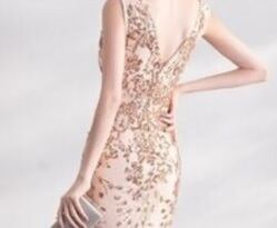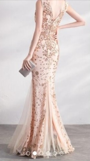 チュールとスパンコールのマーメイドドレス。落ち着いたベージュのチュール地に鮮やかなブラウンのスパンコールをふんだんに使用した豪華なデザイン。くびれたウエストがセクシーさを醸し出しています。パーティやライブ、イベントなど華やかなシーンに。デザイン上伸縮性はそれほどなく体のラインにフィットしたシルエットです。背中ファスナー有。裏地有。