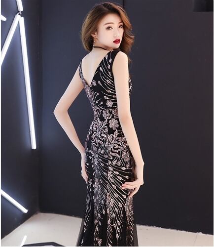 チュールとスパンコールのマーメイドドレス。黒のチュール地に鮮やかな金のスパンコールをふんだんに使用した豪華なデザイン。くびれたウエストがセクシーさを醸し出しています。パーティやライブ、イベントなど華やかなシーンに。デザイン上伸縮性はそれほどなく体のラインにフィットしたシルエットです。背中ファスナー有。裏地有。