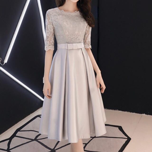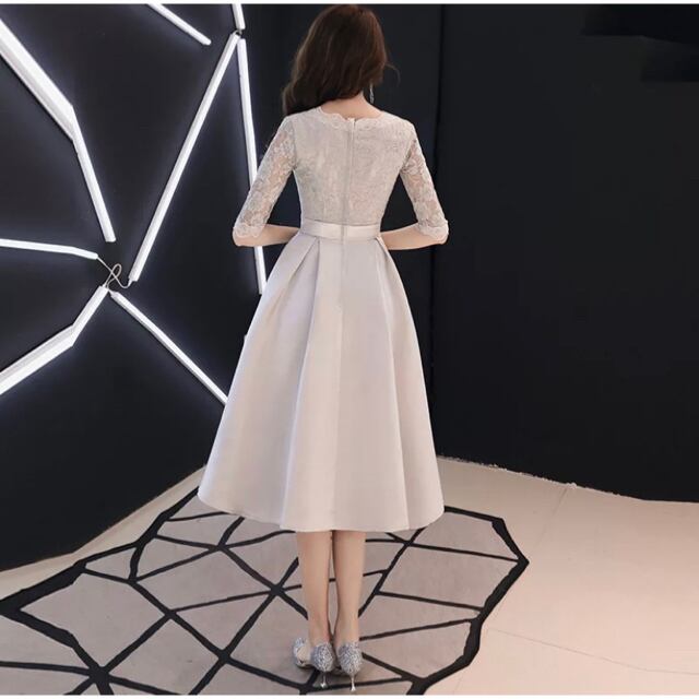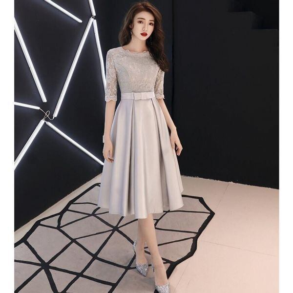 シルバ-の光沢エレガントパ-ティ-ワンピ-スです。気品に満ちたとてもエレガントで上品なひとクラス上をいく一品です。トップス部分のレースの透け感もとても上品でエレガントです。裏地有。背中ファスナ-有。胸パット付き。